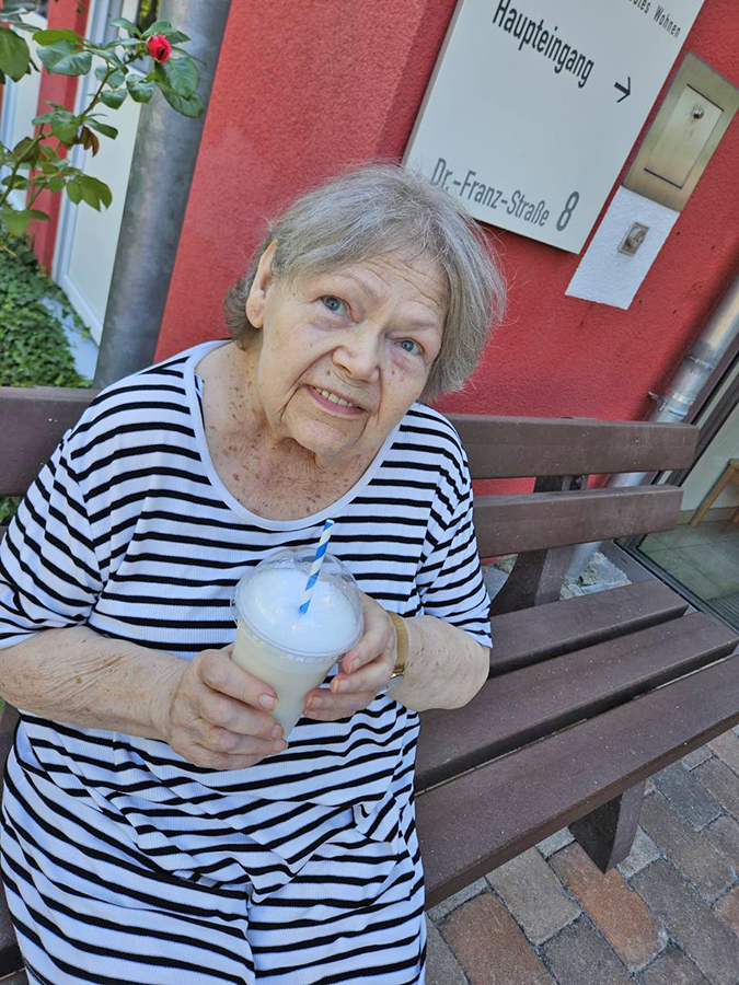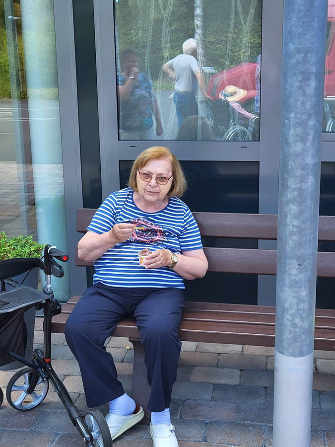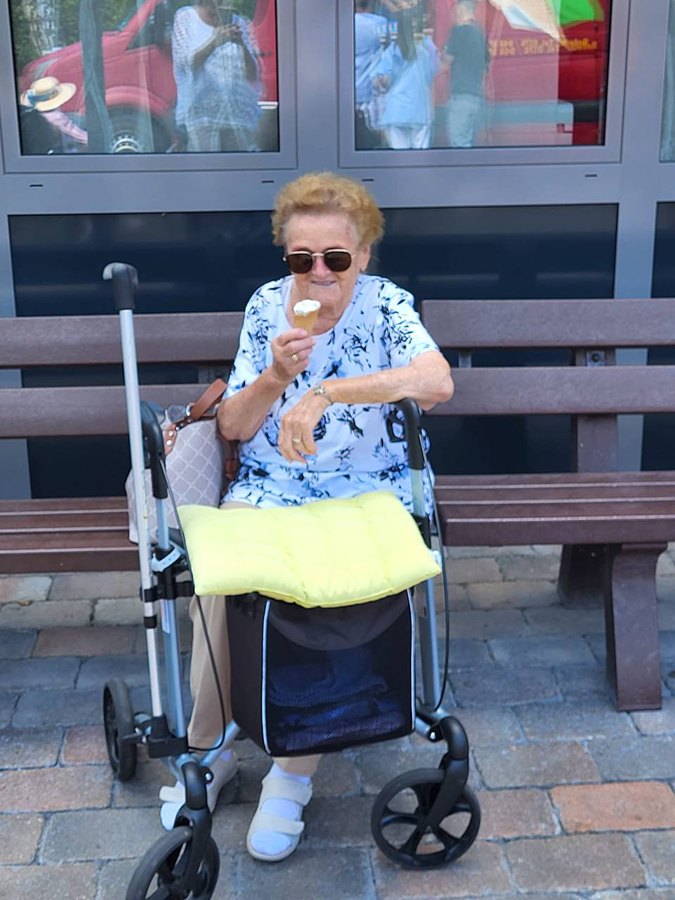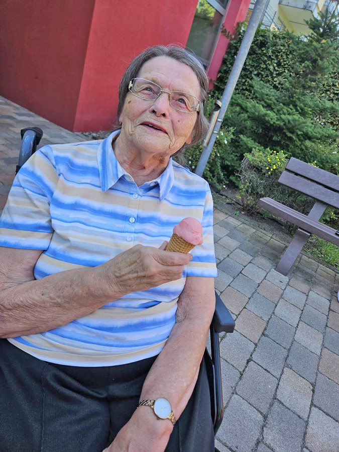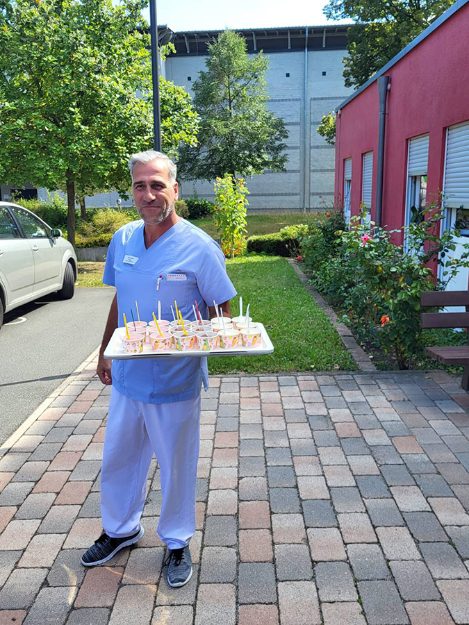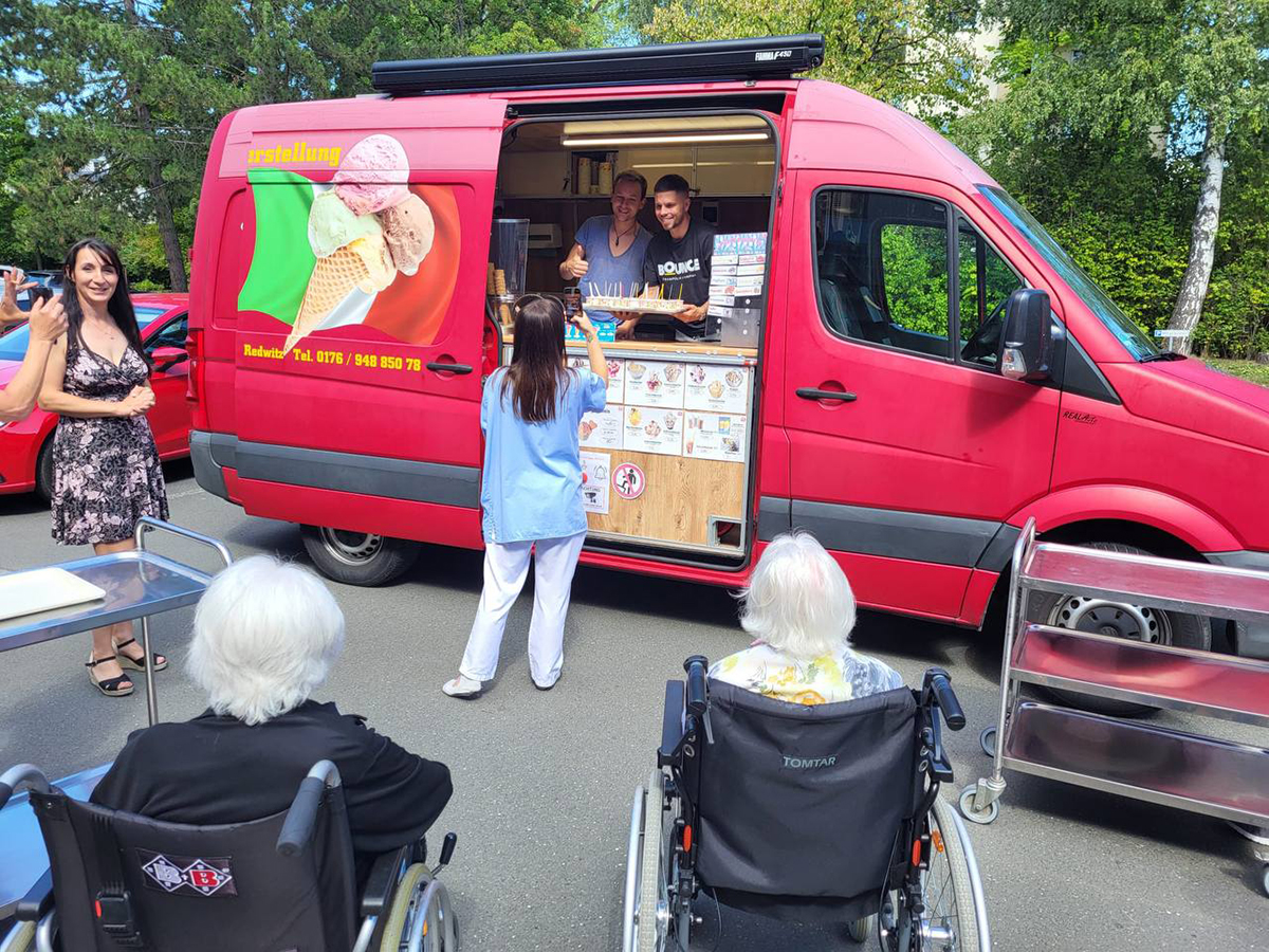Um 14:30 Uhr begann die Eisausgabe direkt vor dem Eingang des Ruhesitzes. Verschiedene Sorten standen zur Auswahl, sodass für jeden Geschmack etwas dabei war. Mit viel Herzblut verteilten die Mitarbeitenden der Einrichtung die Portionen nicht nur an die Bewohnerinnen und Bewohner im Freien, sondern auch an Seniorinnen und Senioren, die ihre Zimmer nicht verlassen konnten.